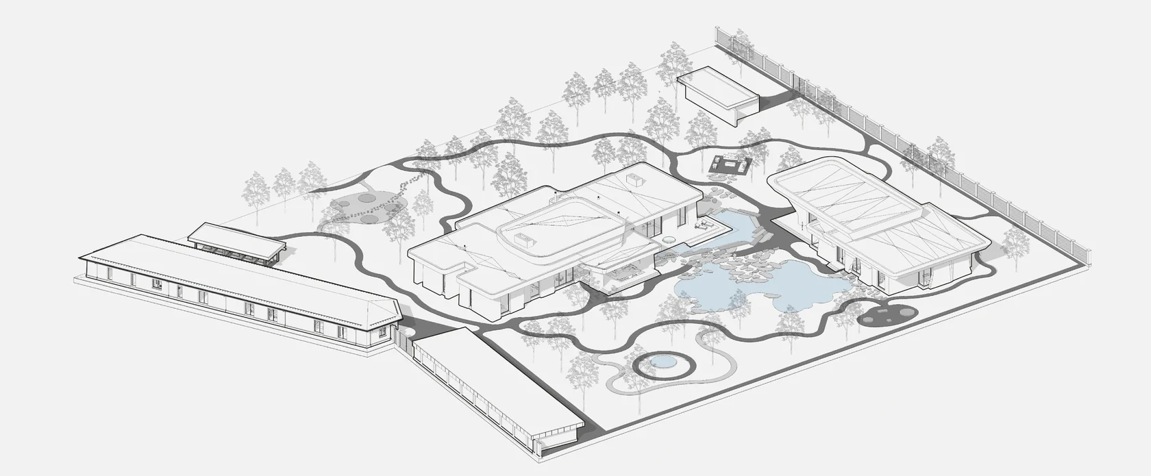 Проект сочетает в себе уникальные архитектурные решения и продуманный ландшафтный дизайн, создавая гармоничную атмосферу для отдыха и взаимодействия с природой. Здания, такие как дом у озера и баня, были спроектированы с учетом особенностей ландшафта, что позволило органично вписать их в окружение. Архитектура включает несколько разновысотных объемов, использующих текстуры натуральных материалов, таких как архитектурный бетон с пигментом, металл и стекло, что придает зданиям монументальность, но в то же время сохраняет легкость и открытость. Просторные террасы и большие окна связывают внутренние пространства с внешним миром, обеспечивая панорамные виды на окружающий ландшафт и создавая ощущение единства с природой.