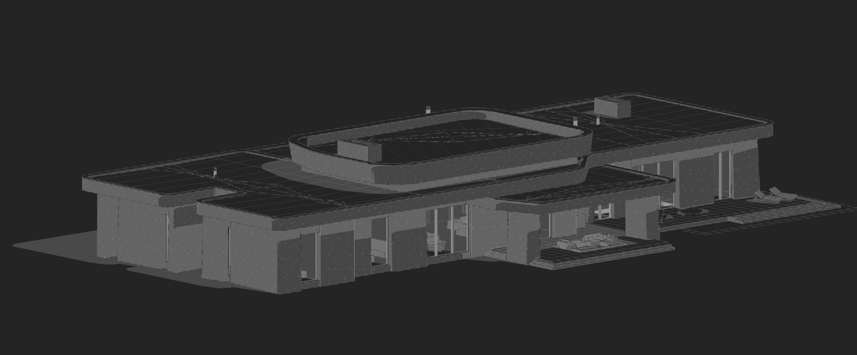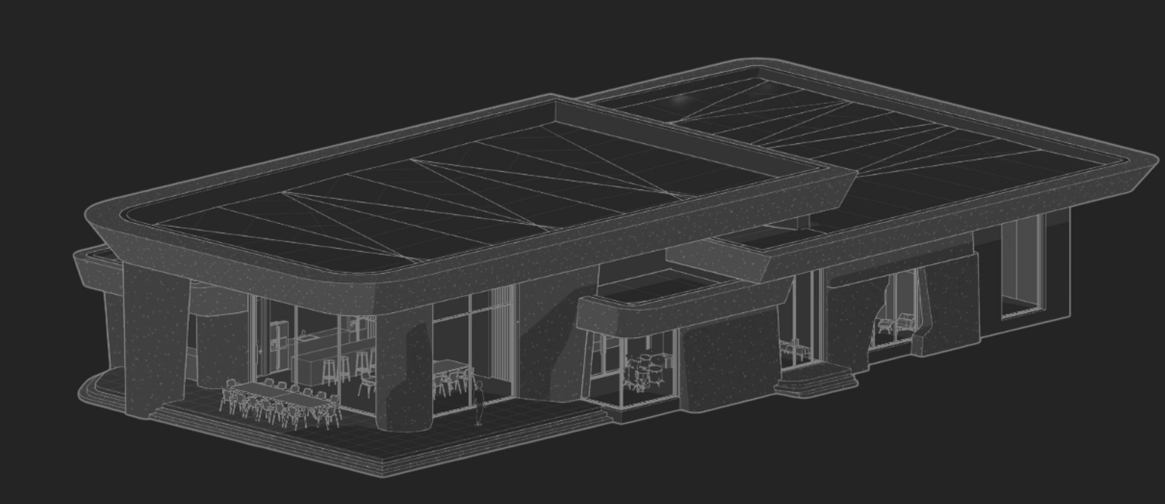 Проект сочетает в себе уникальные архитектурные решения и продуманный ландшафтный дизайн, создавая гармоничную атмосферу для отдыха и взаимодействия с природой. Здания, такие как дом у озера и баня, были спроектированы с учетом особенностей ландшафта, что позволило органично вписать их в окружение. Архитектура включает несколько разновысотных объемов, использующих текстуры натуральных материалов, таких как архитектурный бетон с пигментом, металл и стекло, что придает зданиям монументальность, но в то же время сохраняет легкость и открытость. Просторные террасы и большие окна связывают внутренние пространства с внешним миром, обеспечивая панорамные виды на окружающий ландшафт и создавая ощущение единства с природой.